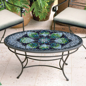 The table features the exquisite Belcarra mosaic design, crafted with hand-laid stained glass in a palette of forest greens and ocean blues. Sealed with a penetrating grout sealer, the mosaic top is both beautiful and durable. The table rests on a hand-wrought base that has been powder-coated for a sleek, smooth finish, ensuring a lasting and elegant addition to your home.
