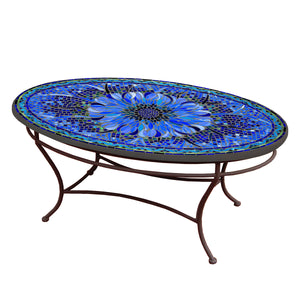 An oval coffee table works well in smaller spaces and their lack of sharp corners makes them a good choice for families with young kids. Be sure to select a coffee table that is no more than two-thirds your sofa's length. Create a beautiful centerpiece for your conversations with our mosaic oval coffee table. This expertly crafted Bella Bloom mosaic design features hand laid stained glass, sealed with a penetrating grout sealer displayed atop a hand-wrought base that has been powder coated to a smooth finish.
