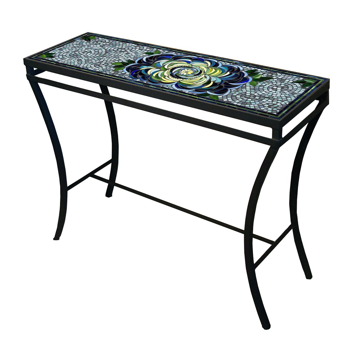 This captivating mosaic art table showcases the beauty of thousands of hand-cut, hand-laid stained glass and marble tiles in sumptuous shades of banana yellow, vibrant green, and watery blues in a contemporary floral design. One large flower takes center stage amongst a backdrop of undulating pastel blue and lilac curves that remind us of Van Gogh’s finest artworks.