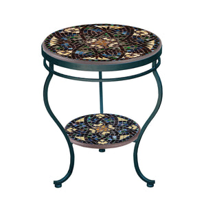 Like all of our beautiful mosaic designs by KNF, the Monaco mosaic double side table is made of hand-cut and hand-laid tiles of tumbled marble and luminous stained glass. Designed for indoor or outdoor use, it has been sealed with a penetrating grout sealer to resist stain. The iron frame has been sandblasted and given a durable powder coat finish.