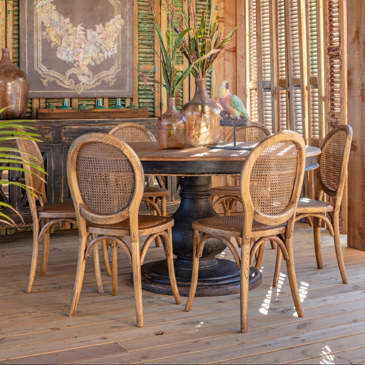 The Hearthstone Pedestal Dining Table – Black reimagines classic farmhouse form with a richer, more dramatic finish. Designed to anchor the room, its generous round top encourages easy conversation, while the sculpted pedestal base provides visual weight and architectural balance.