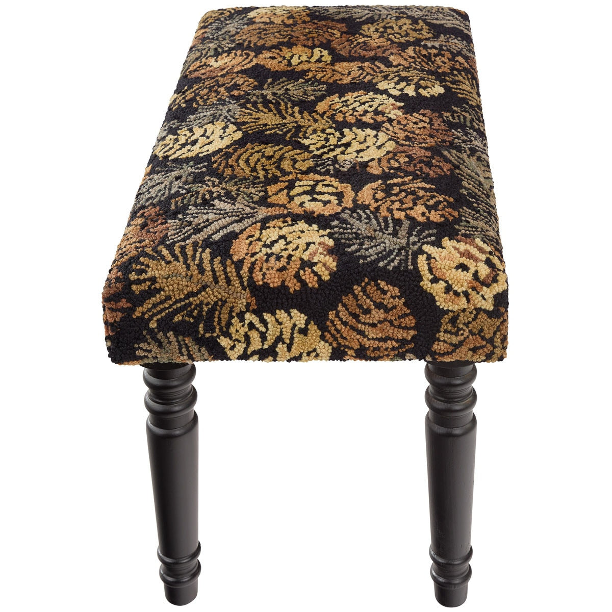 Rooted in traditional craft with a distinctly modern palette, this pinecone-patterned hooked bench brings depth and character to any space. The upholstered top features an intricate botanical design rendered in layered neutrals and warm earth tones, creating visual interest that feels timeless rather than seasonal.
