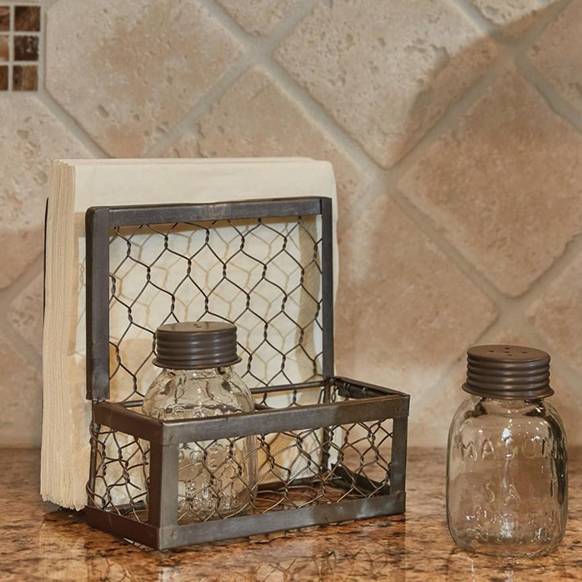 A cute companion for the counter or table. Metal and chicken wire blend to shore up a stack of napkins and create serve yourself space for the salt and pepper shakers that are included.