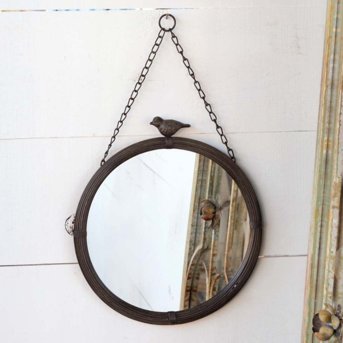 Beautifully ribbed frame with a sociable feathered friend hangs on a chain tilting the mirror just so where needed.appearance.