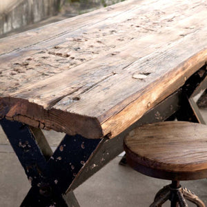 Rustic in a come-as-you-are way. Authentically worn plank top with distressed paint triple X base. Larger than life picnic table with a sack lunch style.