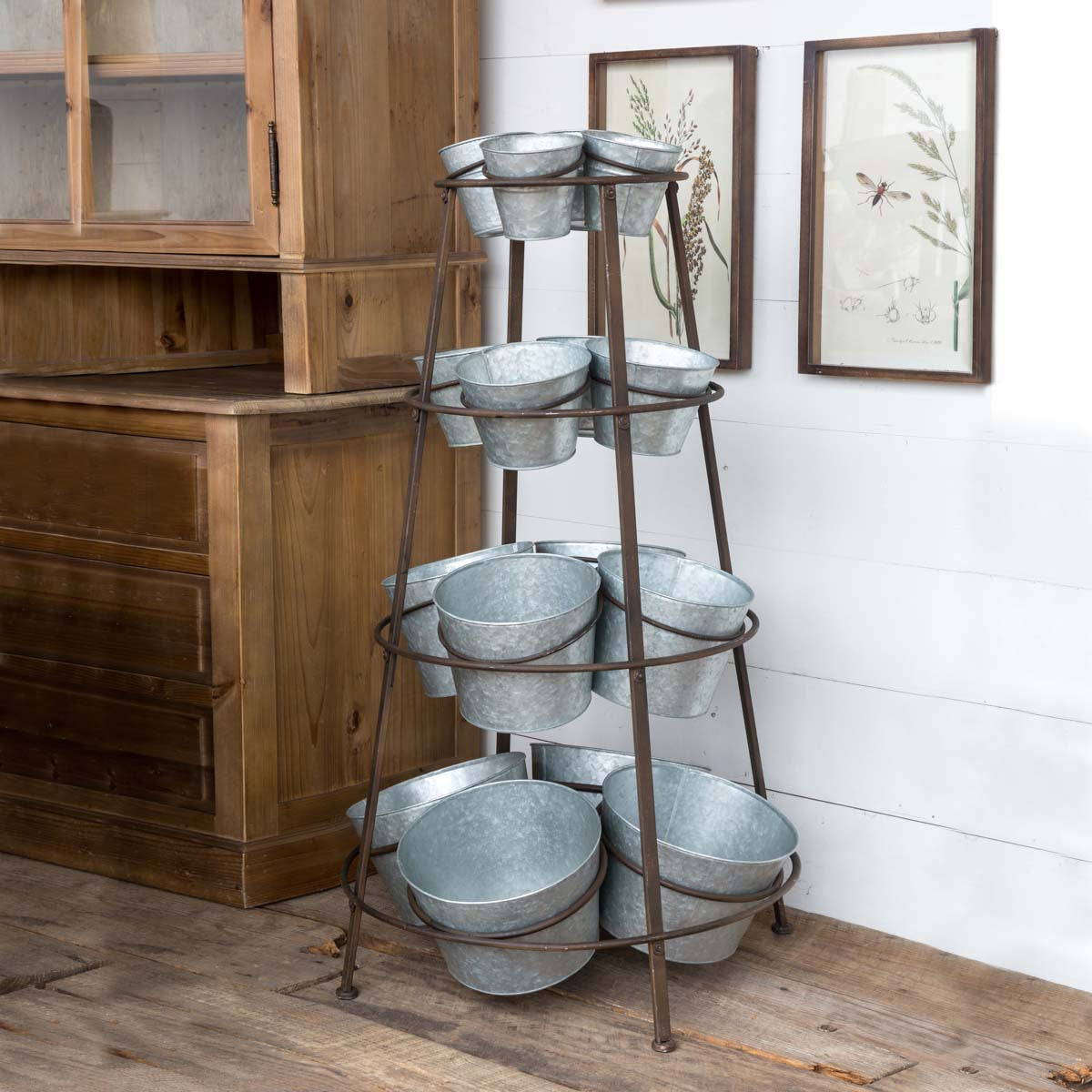 Sixteen metal tubs in graduated sizes adorn this display piece. Practical for a shop or storefront but equally as useful in a home environment to store veggies, pet paraphernalia, flowers or extra linens. Forty six inches tall.