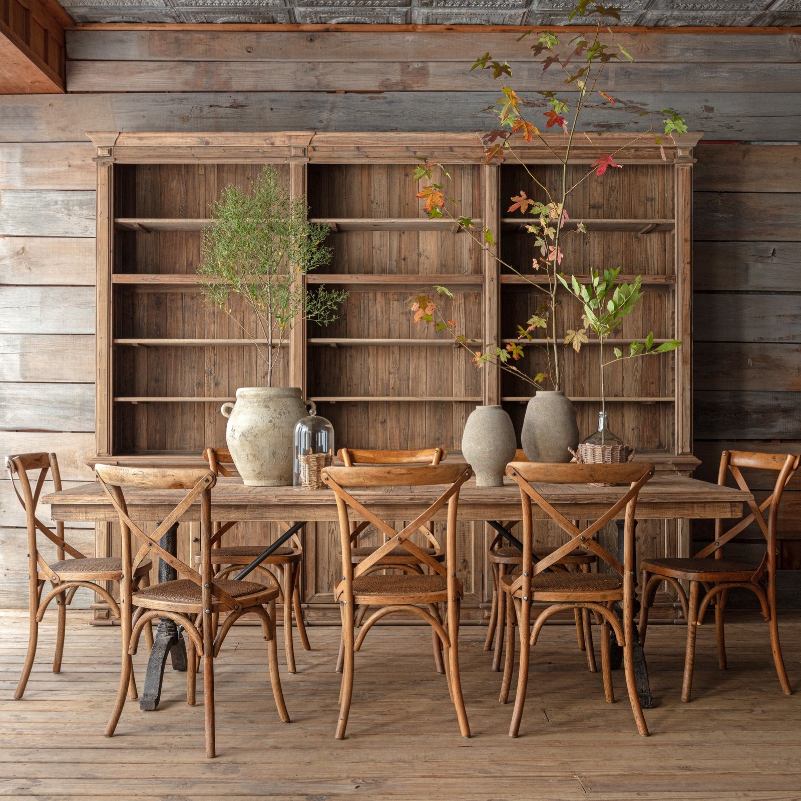 A masterclass in rustic refinement, the Lorraine Pine Library Cabinet brings French country sophistication to large-format storage. Built from old pine with a naturally weathered finish, its grand silhouette features three sectioned columns of adjustable open shelving above, and enclosed cabinetry below for a balanced, purposeful look.