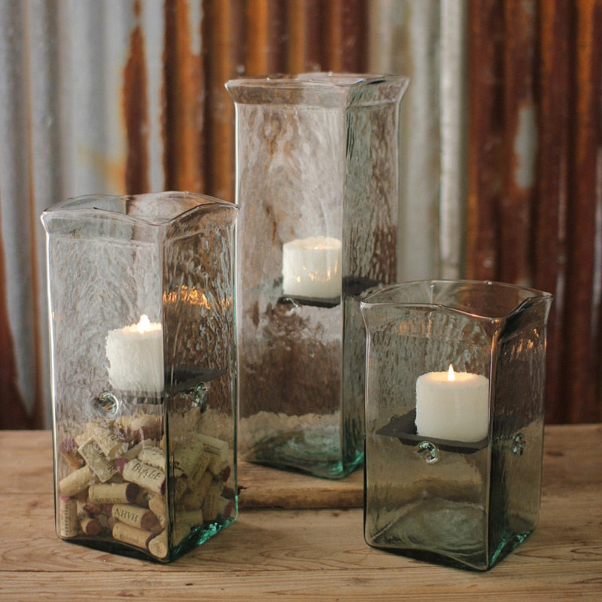 Mouthblown in Colombia from recycled glass, each hurricane features unique variations, soft ripples, and tiny bubbles that celebrate the artistry of the process. The square body feels clean and contemporary, while the wavy rim softens the look for an elevated yet easygoing feel. The included rustic metal insert is fully removable and holds a standard 1" candle (LED recommended for safety and convenience).