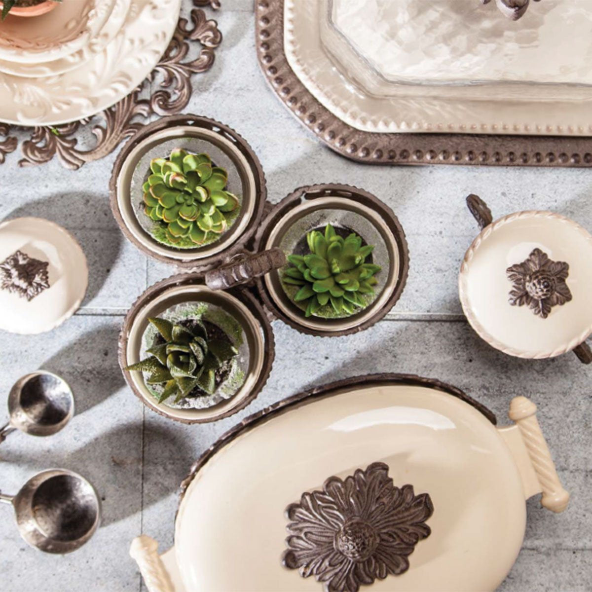 For rustic table settings - Shop theHeritage Collection, which features an array of serving trays, candle holders and more made with fine metal accents, and let your presentation tell a story. These pieces are made to help outfit a dining table without diverting from the focal point - the food!