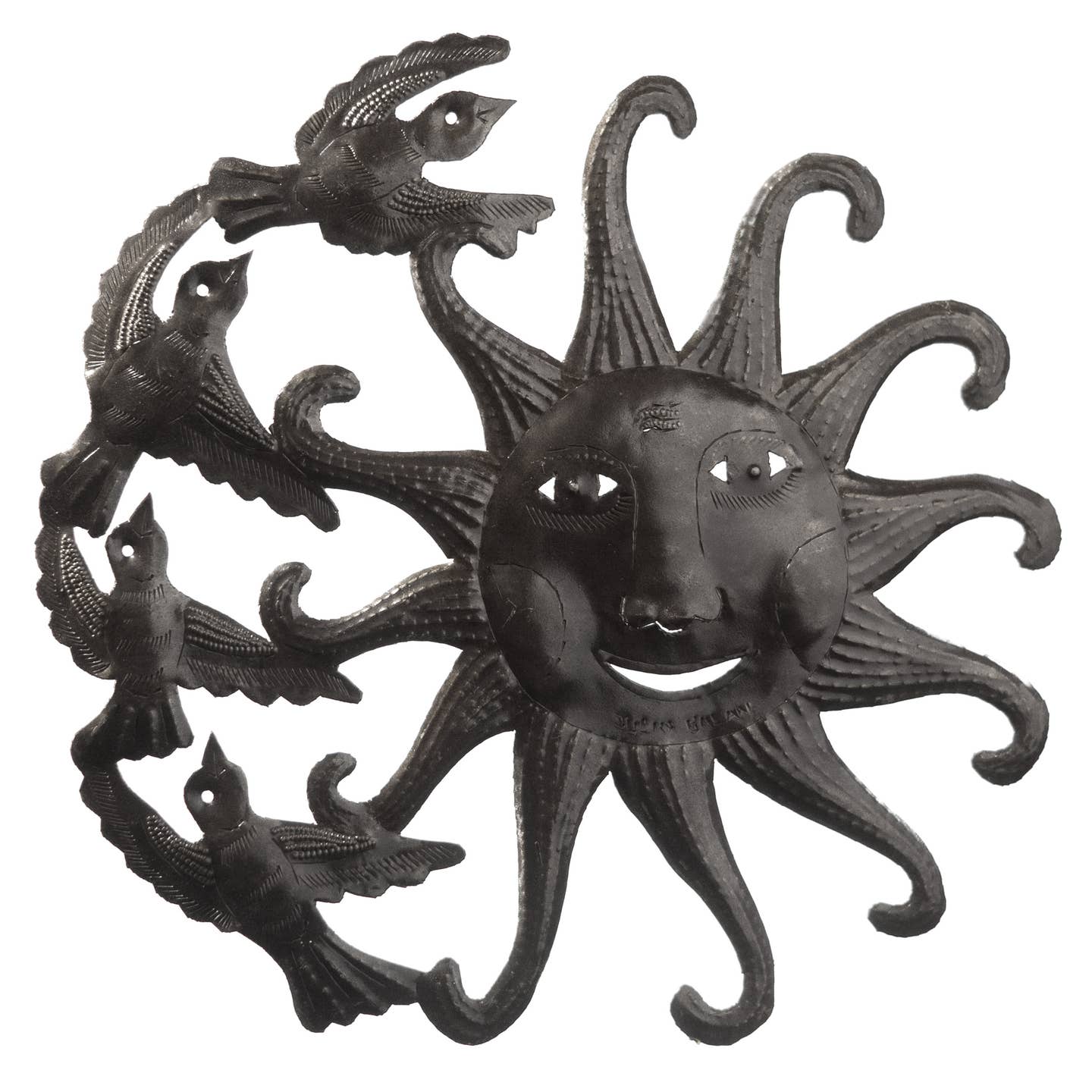 The Radiant Chorus Sun & Birds is a celebration of light and life. Shaped by hand from reclaimed steel, its design pairs a smiling sun with a flock of songbirds rising in graceful arcs. Each feather and sunray is hand-tooled with texture, creating dimension and movement that shifts beautifully in changing light. At 15 inches in diameter, it offers versatile placement - brightening a living room, anchoring a gallery wall, or adding a whimsical focal point to garden and patio spaces. Outdoors, it can be left to weather into a natural patina or kept luminous with a clear varnish, making it a timeless piece of art for any setting.