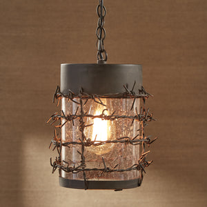 The Rustic Frontier Barbed Wire Pendant is a one-of-a-kind lighting fixture that blends raw, industrial aesthetics with rustic charm. Suspended from a sturdy metal chain, the cylinder-shaped pendant features seeded glass, creating a beautifully diffused glow. Wrapped in rugged barbed wire detailing, this bold design makes a strong statement in Western, farmhouse, or lodge-style interiors.