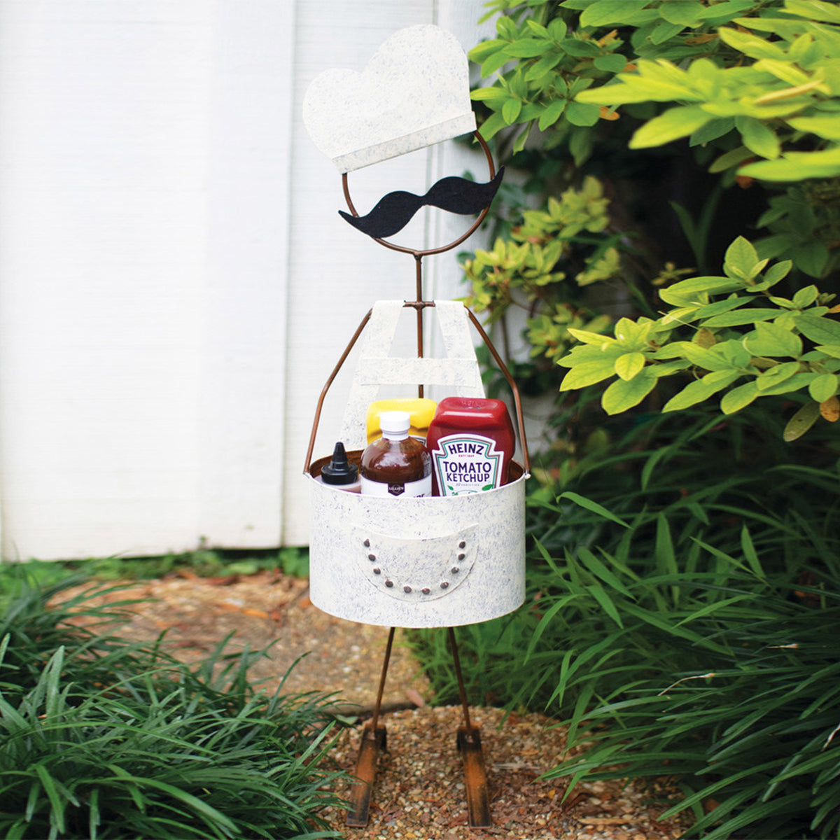 The BBQ Buffy isn't just a condiment holder; he's a statement piece for your patio parties. Crafted from durable metal and iron, and standing at an impressive 35 inches tall, this delightful chef brings personality and practicality to your BBQ setup. His distressed finish lends a vintage charm that complements any rustic or eclectic outdoor decor. Fully assembled and ready to roll, he ensures your sauces and spices are always within arm's reach, making every cookout a culinary celebration.