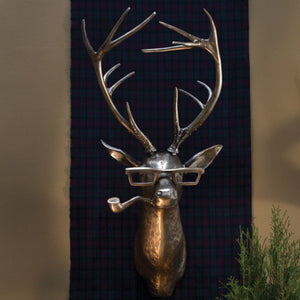 Step into a realm where whimsy meets sophistication with "The Dapper Buck"! This wall piece is a true marvel that will leave you enchanted. Picture a shimmering metallic gold deer head, perfectly mounted on your wall, but it is not your average deer head. Oh no! This dashing fellow exudes an air of refined charm and intellectual flair. Sporting a pair of stylish glasses perched upon its golden snout, it's clear that this buck possesses both wisdom and a penchant for the finer things in life. But that's not all - look closely, and you'll notice a tiny pipe clenched between its metallic jaws.
