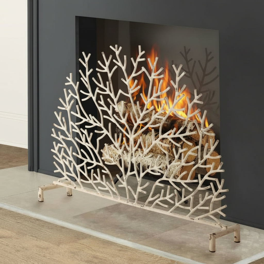 Forged from iron and hand-finished in a creamy, softly weathered patina, this fireplace screen delivers refined texture without heaviness. The branching openwork design offers a romantic silhouette while allowing firelight to glow through. Fixed feet add stability, and the neutral tone makes it a lovely complement to stone fireplaces, light woods, and soft textiles. Perfect for rooms that embrace calm, natural beauty.