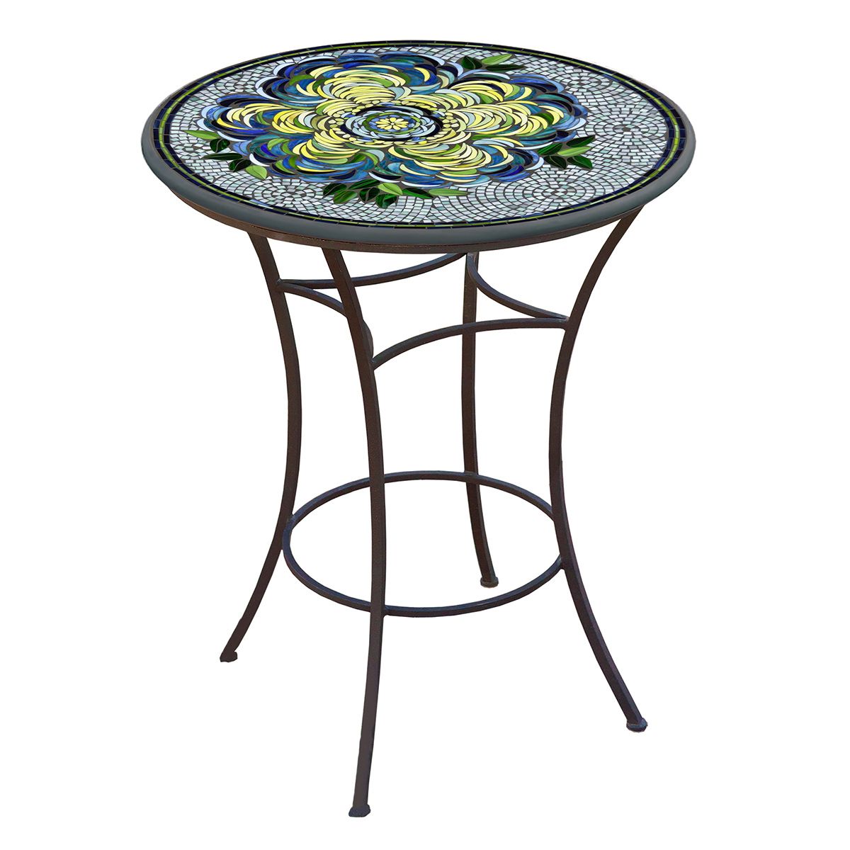 High dining tables also known as pub, gathering, or standing tables are perfect for entertaining. This high dining table with our Giovella mosaic is available in a 42 bar height, it can be customized by selecting a 36" or 42" diameter top to fit your space. Our expertly crafted Giovella high dining tables feature hand laid stained glass mosaics, sealed with a penetrating grout sealer displayed atop a hand-wrought aluminum table stand that has been powder coated to a smooth finish.