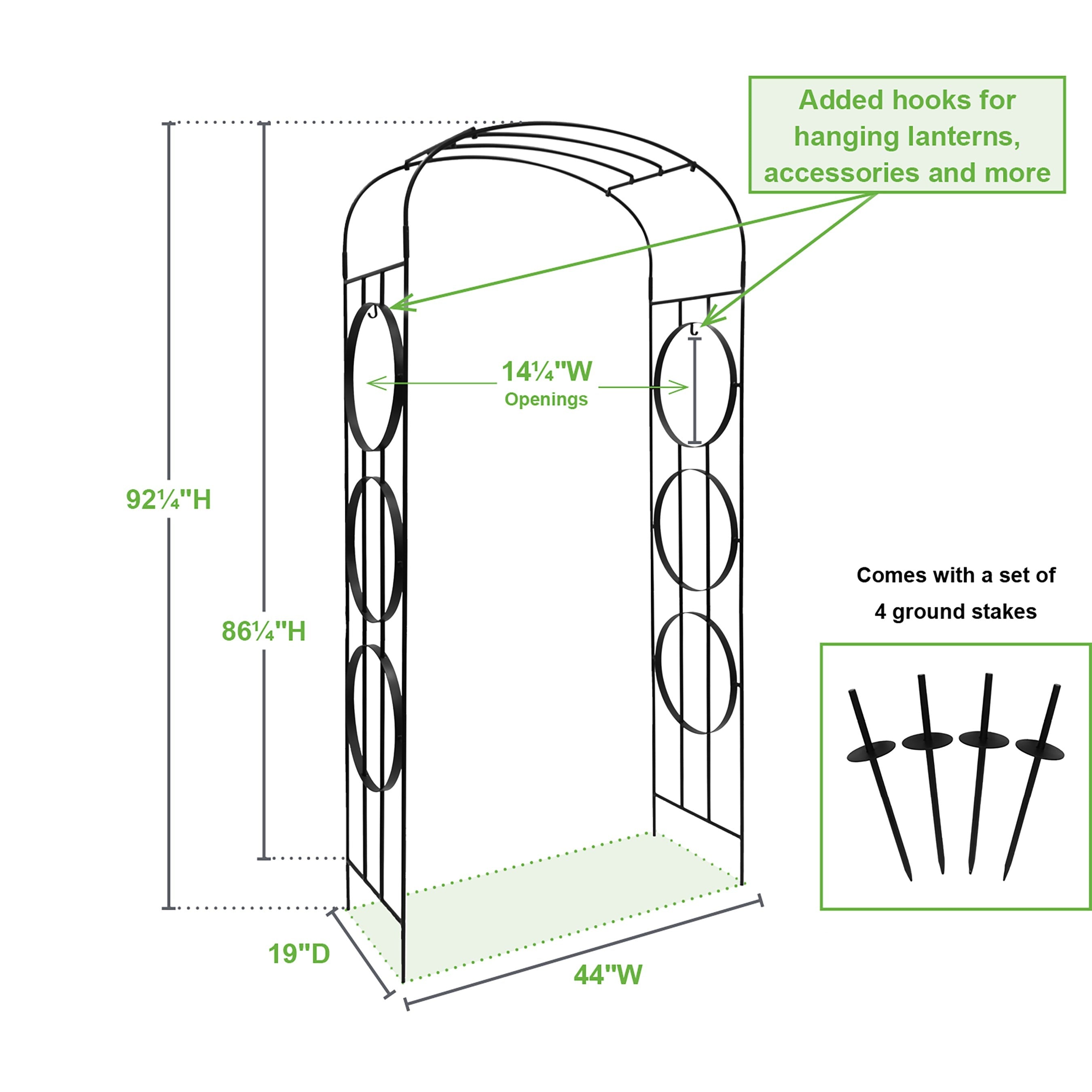 Make a grand statement in your garden with the Hospitality Garden Arbor, a striking blend of timeless elegance and architectural charm. Featuring graceful circular motifs and bold, clean lines, this tall arbor creates a captivating entryway that instantly elevates any outdoor space. Thoughtfully designed, each side panel includes a built-in hook - perfect for hanging lanterns, seasonal wreaths, or delicate floral accents to enhance its unique character.