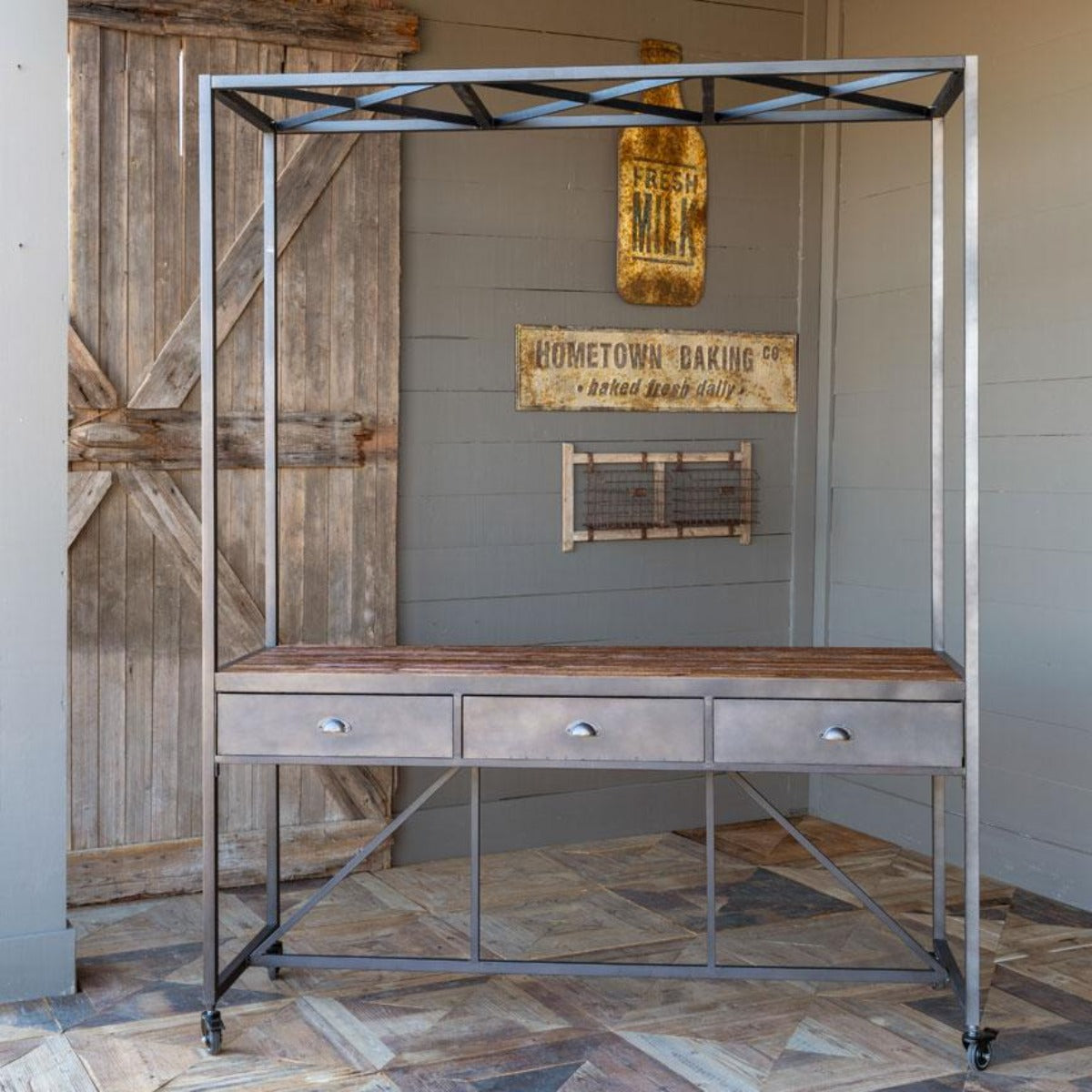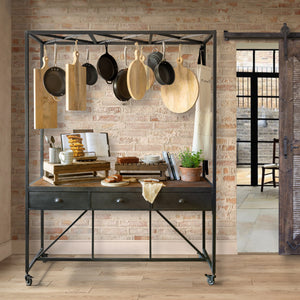 This industrial-style work island sits atop casters for mobility and versatility. Features include a reclaimed wood top and metal frame with drawers.