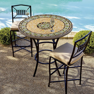 High dining tables also known as pub, gathering, or standing tables are perfect for entertaining. This high dining table with our Malibu mosaic is available in a 42 bar height, it can be customized by selecting a 36" or 42" diameter top to fit your space. Our expertly crafted Malibu high dining tables feature hand laid stained glass mosaics, sealed with a penetrating grout sealer displayed atop a hand-wrought aluminum table stand that has been powder coated to a smooth finish.