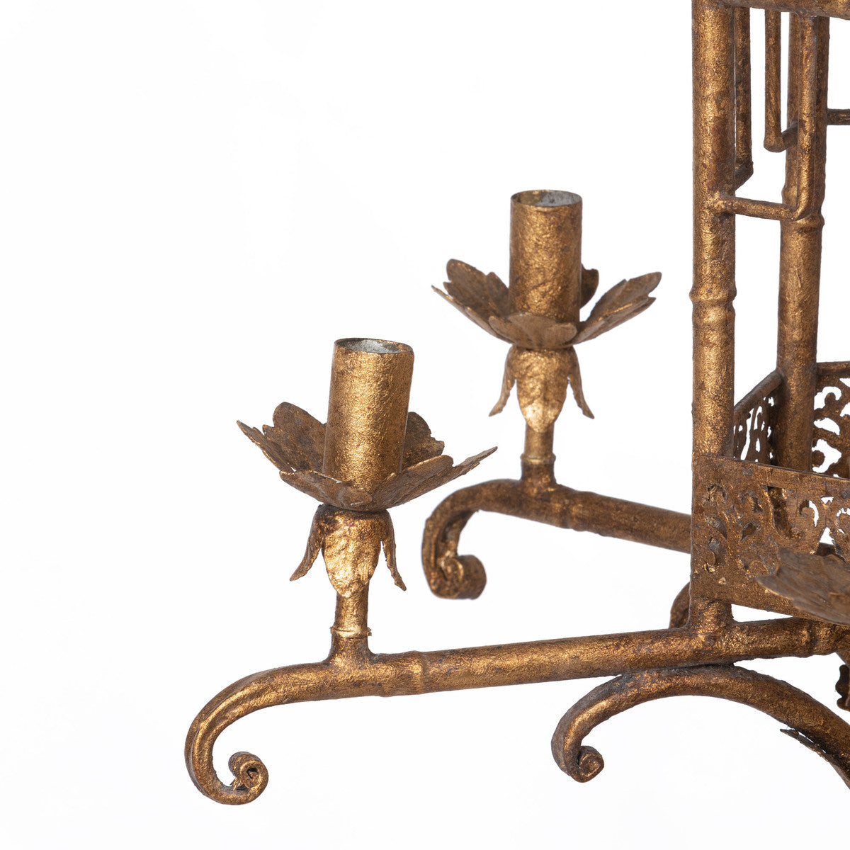 Experience the beauty of this hand-forged masterwork of iron and tole, designed with a distinctive Asian flair. Bring the allure of the Pagoda Chandelier into your space, and elevate your design aesthetic to new heights.