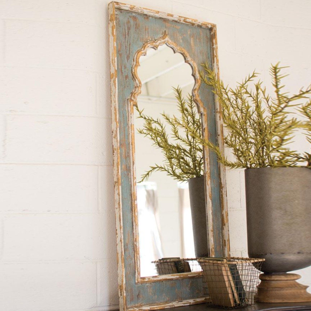 Rustically rendered in painted wood, this mirror reflects the style of old Morocco with its scalloped dome inset. At fifty two inches tall it would be a statement maker whether hung or leaning.
