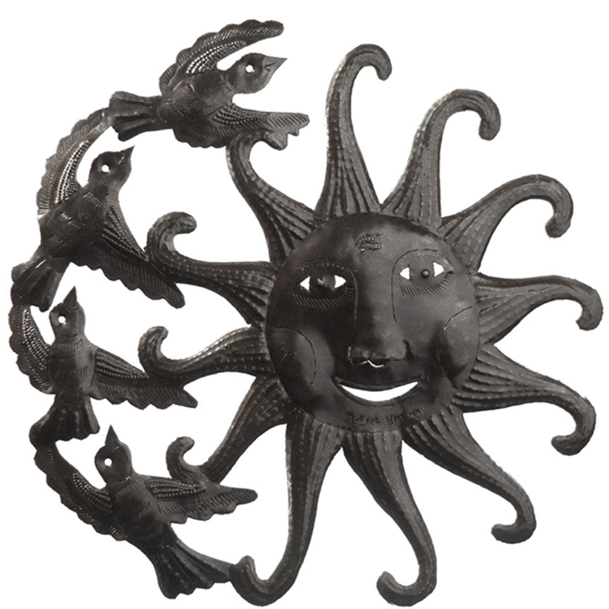 The Radiant Chorus Sun & Birds is a celebration of light and life. Shaped by hand from reclaimed steel, its design pairs a smiling sun with a flock of songbirds rising in graceful arcs. Each feather and sunray is hand-tooled with texture, creating dimension and movement that shifts beautifully in changing light. At 15 inches in diameter, it offers versatile placement - brightening a living room, anchoring a gallery wall, or adding a whimsical focal point to garden and patio spaces. Outdoors, it can be left to weather into a natural patina or kept luminous with a clear varnish, making it a timeless piece of art for any setting.