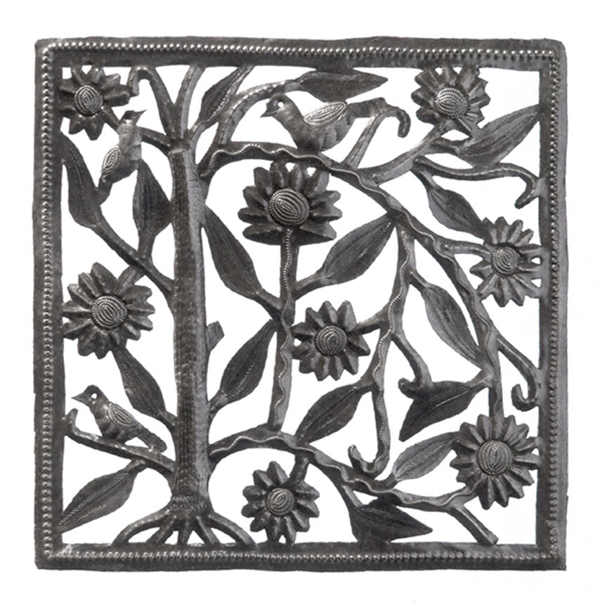 Alive with texture and charm, the Sunflower Serenade Plaque celebrates the beauty of blooms and birds in perfect harmony. Artisans transform reclaimed steel oil drums into a square panel of sunflowers, their petals delicately hand-tooled for depth and dimension. Look closely, and you’ll spot small birds nestled among the vines, adding a sense of playfulness to the scene. Measuring 15 inches square, this piece is versatile enough to enliven an entryway, kitchen, or gallery wall, while durable enough for outdoor display on a porch or garden fence. Left untreated, it will gradually weather to a soft patina, or maintain its metallic brilliance with a coat of clear varnish.