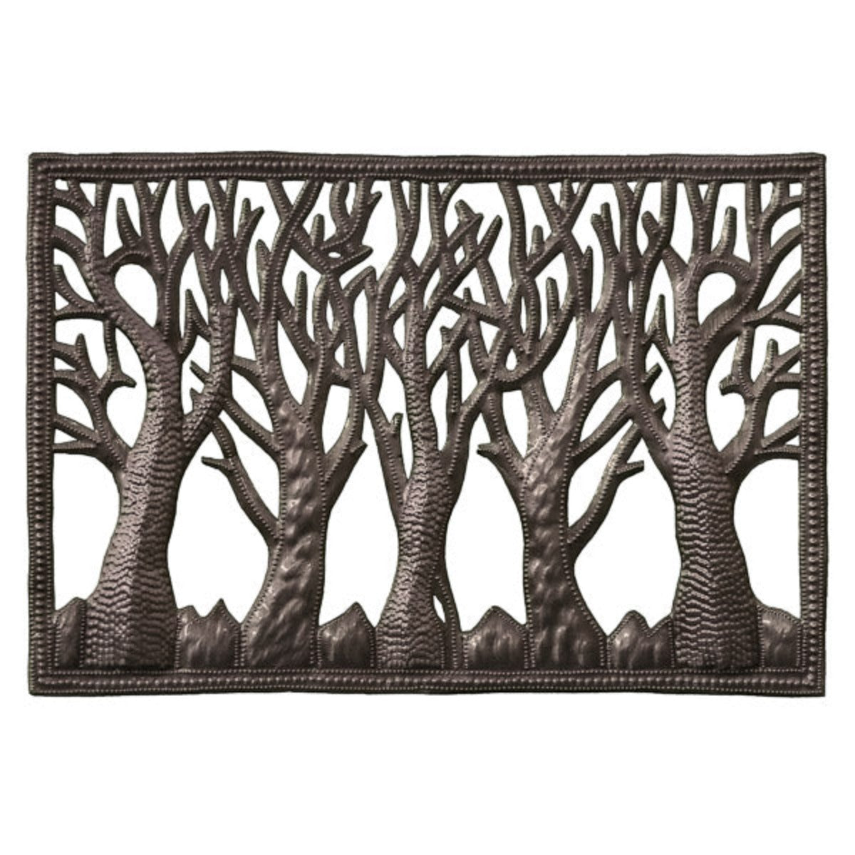 Handcrafted from recycled steel, the Whispering Winter Trees plaque captures the stark beauty of a bare forest. At 17 by 12 inches, it adds rustic, sculptural elegance to any wall.
