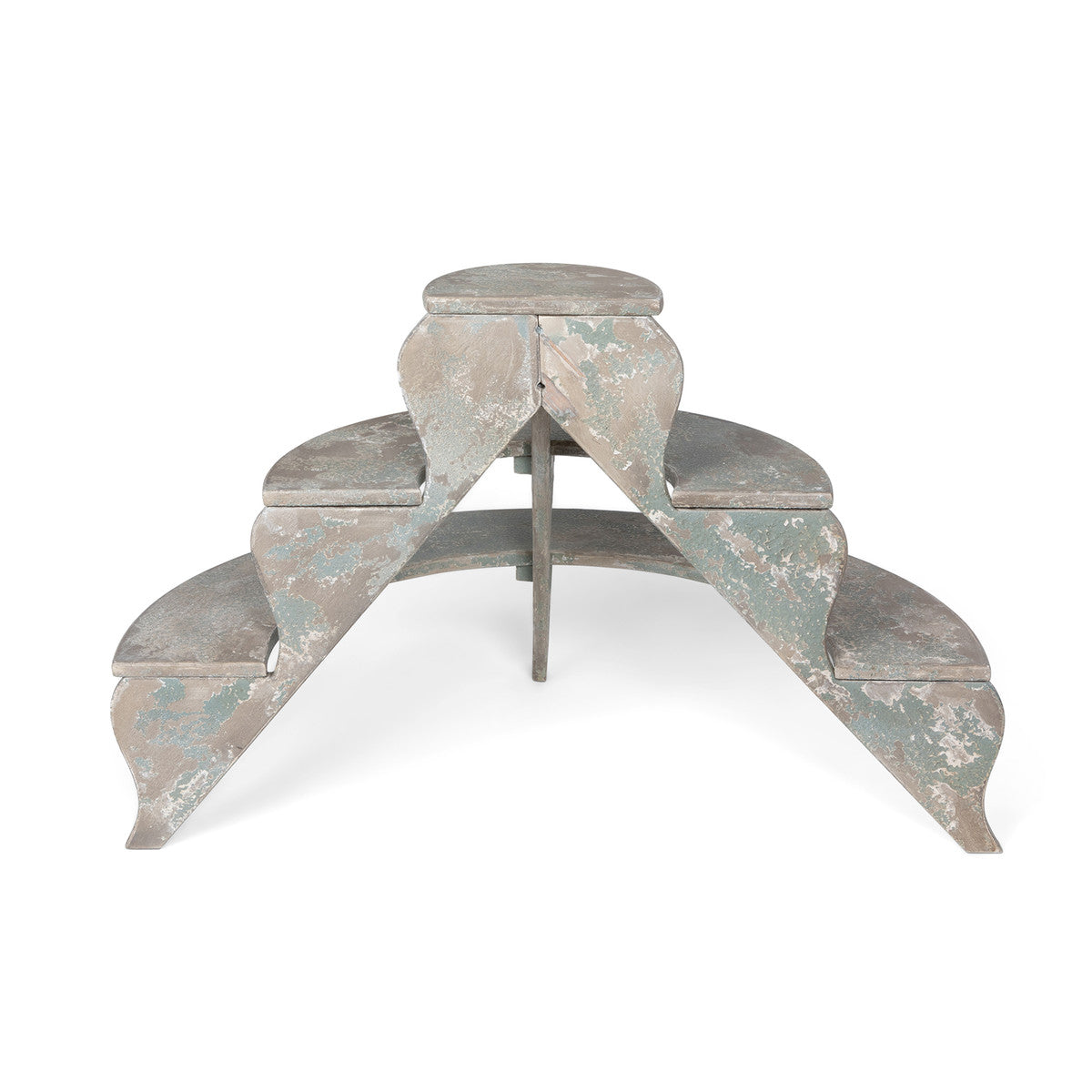 Add timeless charm and depth to your plant displays with this stunning three-tiered wooden stand. Featuring gracefully curved crescent tiers, the rustic design offers both architectural elegance and functional versatility. Handcrafted and painted in an antiqued finish, this stand showcases ornate details that elevate any indoor or outdoor setting.